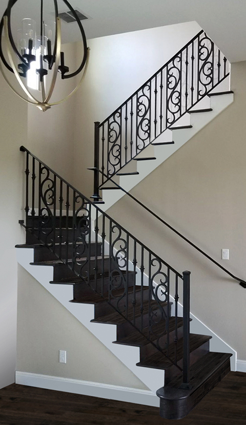 The Cadence Railing by Magnolia Doors blends symmetry and ornamentation in a design that flows effortlessly along staircases and corridors. With alternating solid pickets and graceful scroll motifs, this custom iron railing strikes a perfect balance between classic styling and architectural order — ideal for homes that favor elegance without excess.