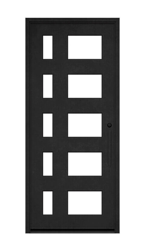 The Euphony Door balances thick, horizontal bars with a staggered grid of rectangular and square openings—offering a composition that feels musical in flow and solid in presence.