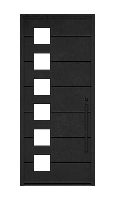 The Harmony Door features five evenly spaced square cutouts along one edge, creating a visual cadence that’s both balanced and bold. Its offset window pattern draws the eye, while solid horizontal panels ground the design in strength.