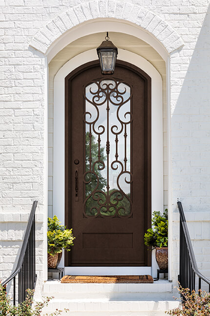 Magnolia’s Monaco Door features sweeping iron curves and balanced symmetry—bringing Mediterranean elegance to courtyards and stucco homes.